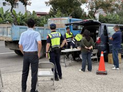 埔里警方会同环保局稽查乌贼车,当场检测数值是否合格。(埔里警方提供) 南投县埔里镇和国姓乡居民长期遭改装车噪音干扰,南投县环保局在台14线国...