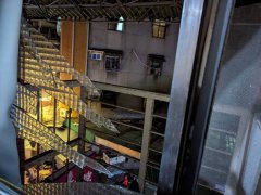 气爆建物共用楼梯间严重毁损。(记者黄政嘉摄)