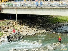 南投水里乡水里溪赫见汽车卡溪底,民众议论纷纷,消防署则解释是在进行洪灾演练。(记者刘滨铨摄) 南投水里乡流经市区的清澈水里溪,是当地重要观...