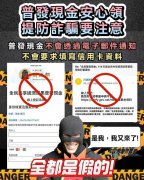 普发现金防诈宣导图。(刑事局提供) 行政院于9月通过「中央政府因应国际情势强化经济社会及民生国安韧性特别预算案」,编列总额5500亿元,其中包含...