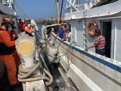 海巡人员赶紧布起多条水管利用抽水机赶紧抽干海水。(图由海巡队提供) 海巡署舰队分署日前接获通报,1艘台南将军籍大型渔船突然机械故障,在云林...